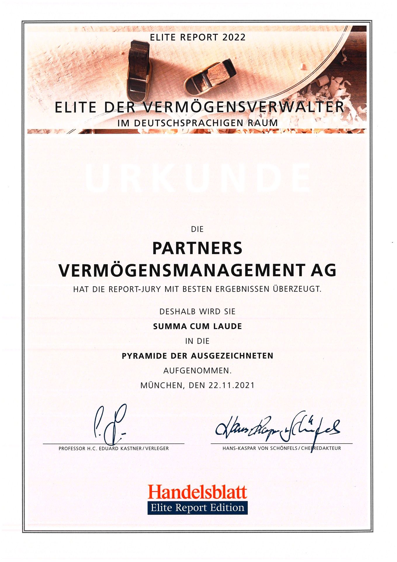 Wir freuen uns sehr, dass sich PARTNERS VermögensManagement AG in der höchsten Kategorie „Elite der Vermögensverwalter 2022 – Summa cum laude“ qualifizieren konnte. Diese Auszeichnung bestätigt unsere Unternehmensphilosophie, vermögende Anleger individuell, unabhängig und ganzheitlich zu betreuen.